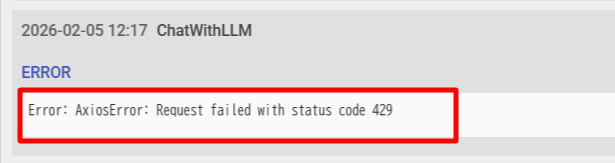 OpenAI Platformアカウント利用時でも、API利用のための クレジット(残高)がチャージされていない場合には、ChatWithLLMアクション実行時に以下のようなエラーになります。