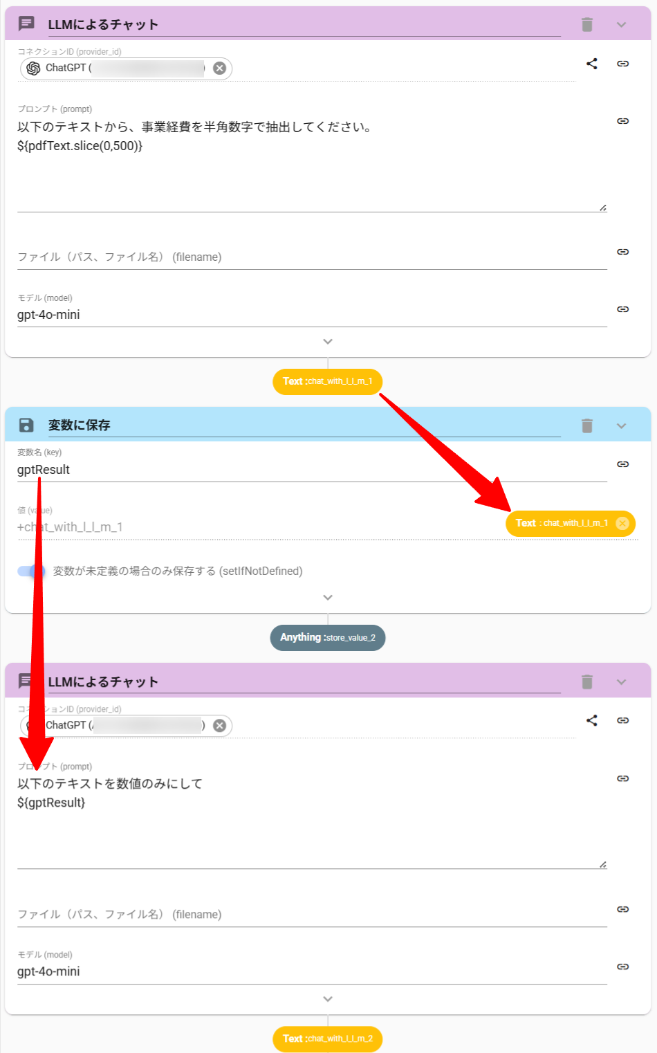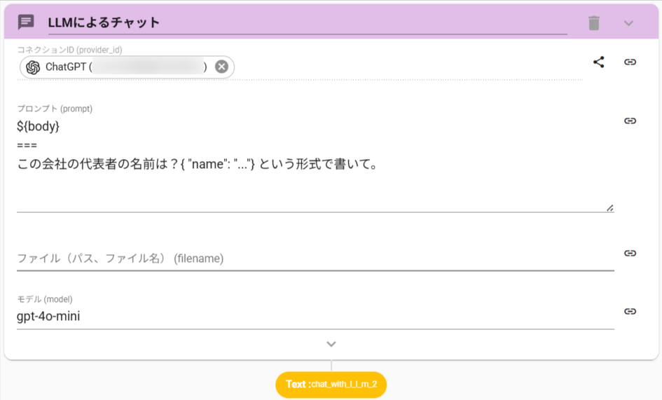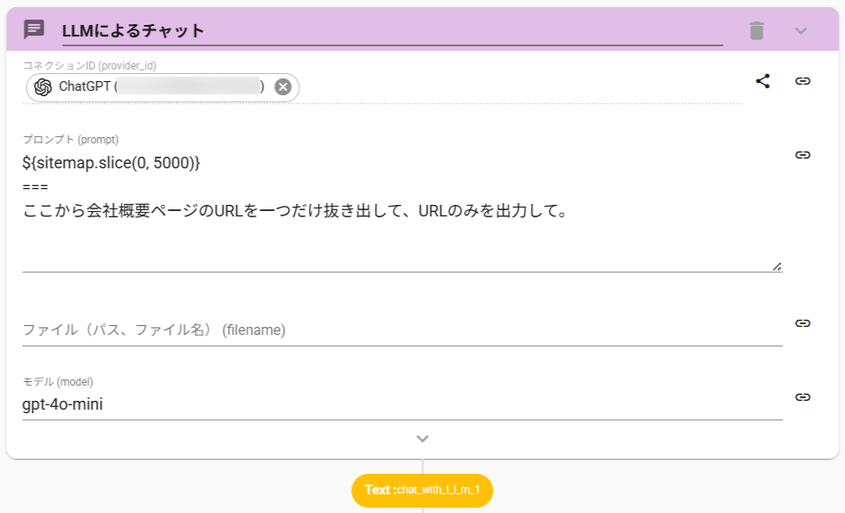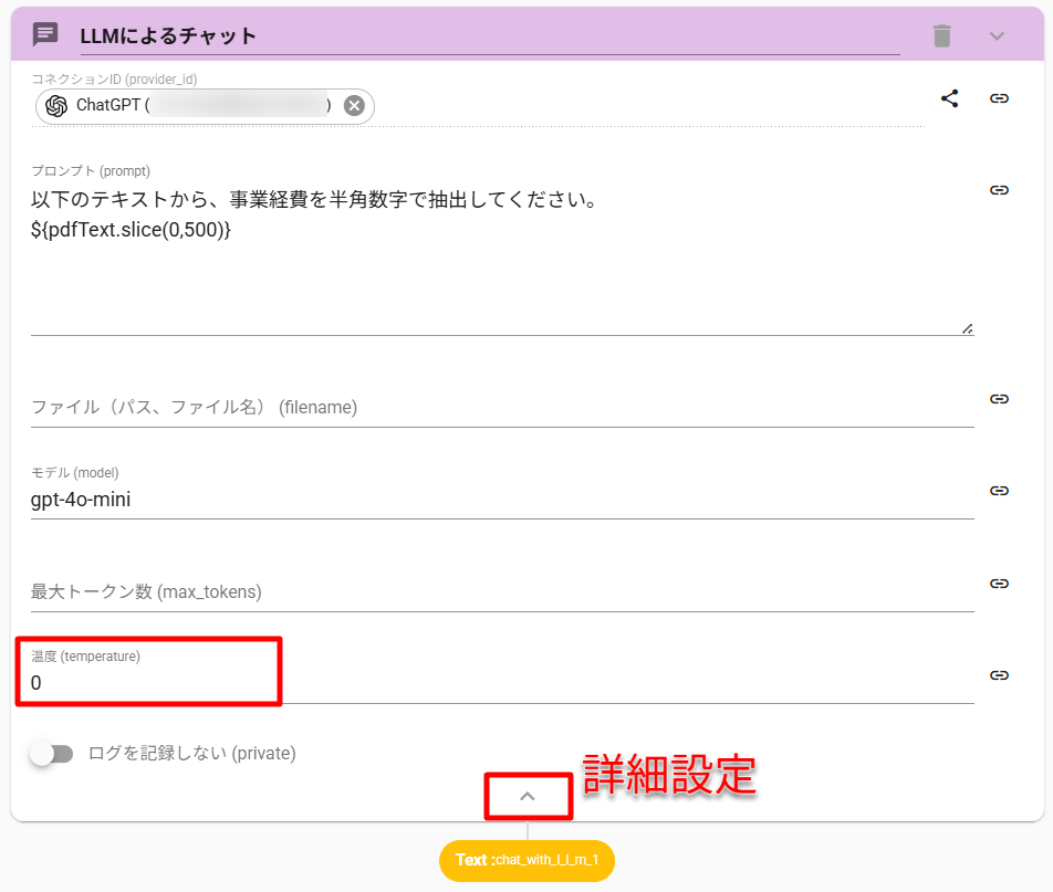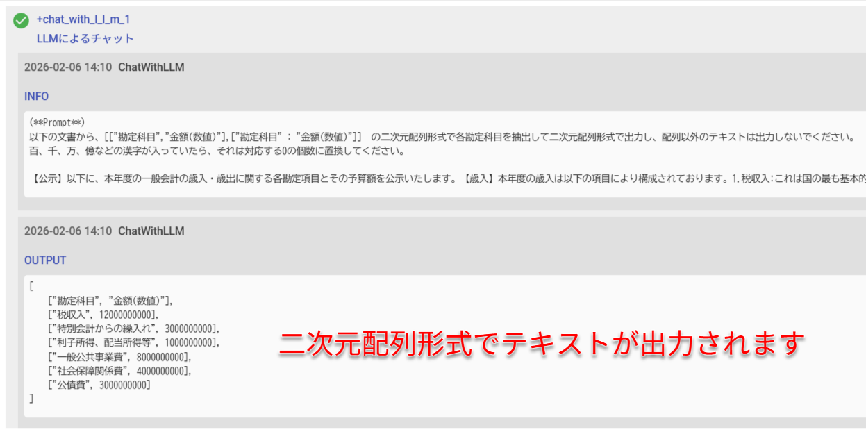 ここから数値のみを抜き出す操作も、ChatWithLLMアクションで実現できます。