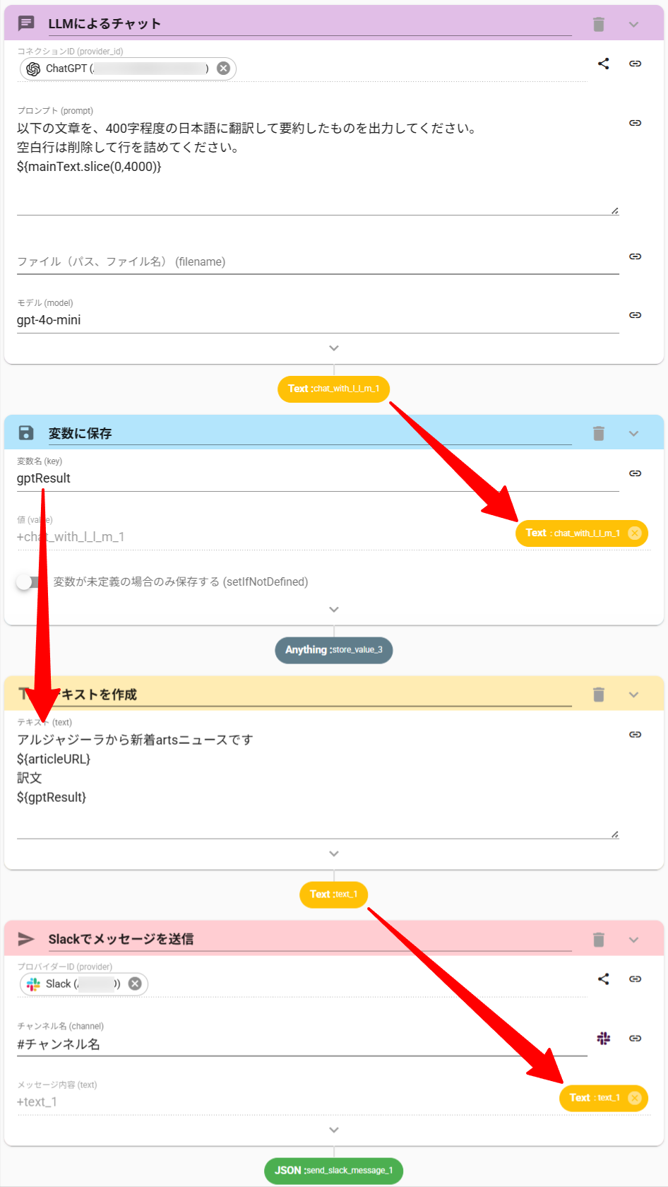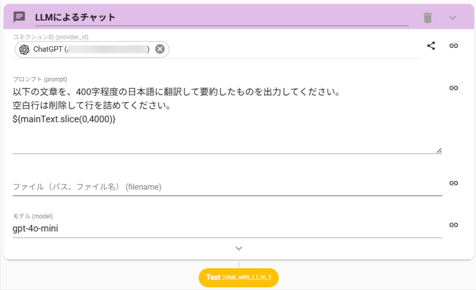 ChatGPTに読み込ませる情報量が多いと、アクションがエラーになってしまう場合があります。これを防止するために、前半500文字を読み込ませています。