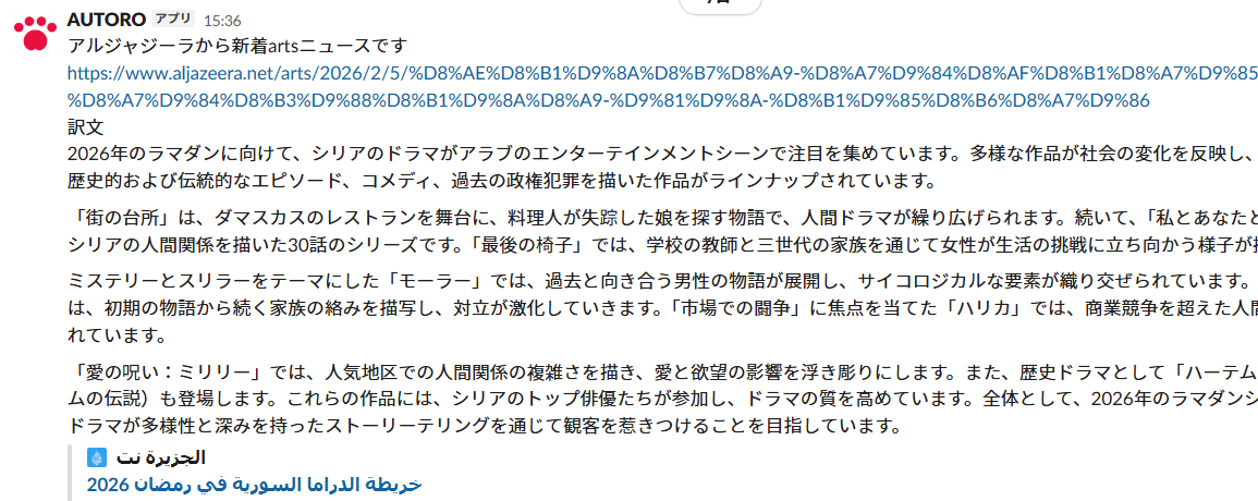 text: "アルジャジーラから新着artsニュースです\n${articleURL}\n訳文\n${gptResult}"