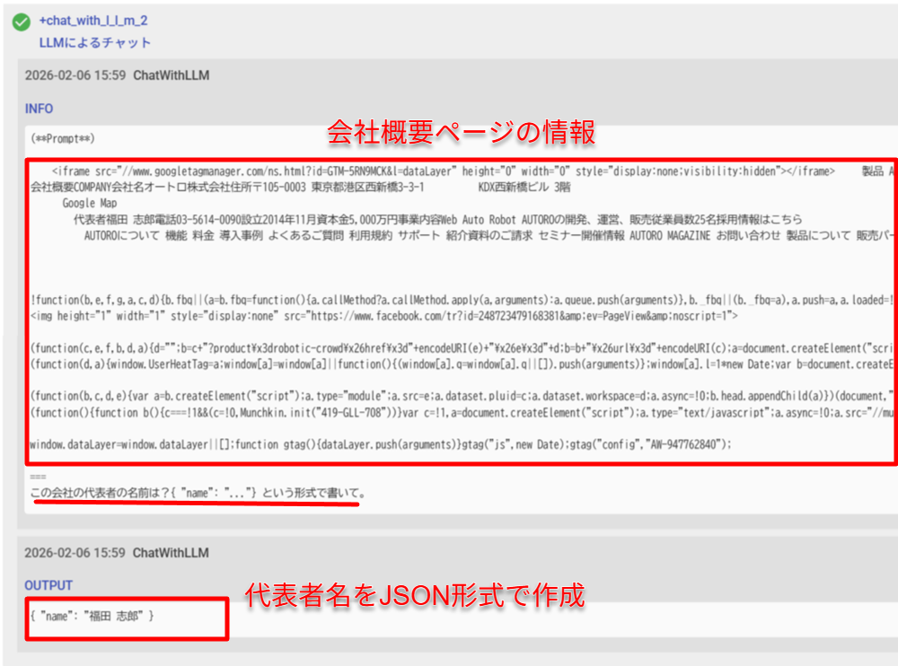 会社概要ページの本文が取得できています。あとはここから代表名を抽出してもらいましょう。