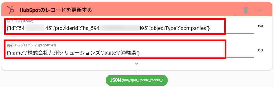 {"id":"${output['id']}","providerId":"${output['providerId']}","objectType":"companies"} - 「更新するプロパティ」に、プロパティ内部名「name」「state」と、更新する値をオブジェクト形式で設定します。