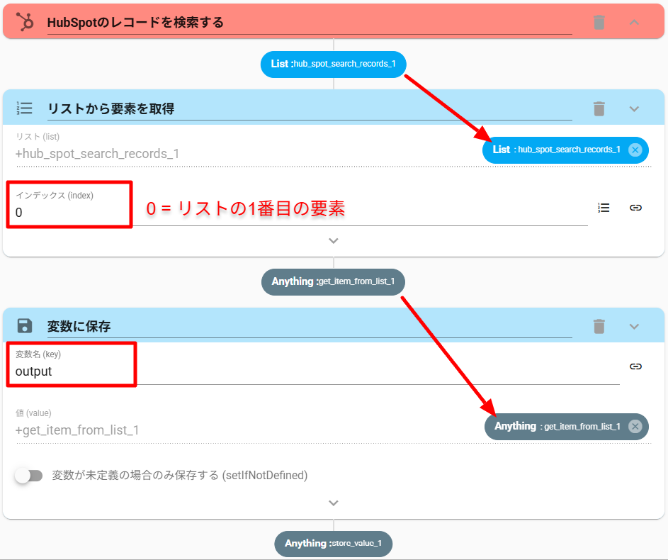 HubSpotSearchRecords の検索結果はリスト形式になりますので、まずリストから1行目(1番目の要素)を取得します。