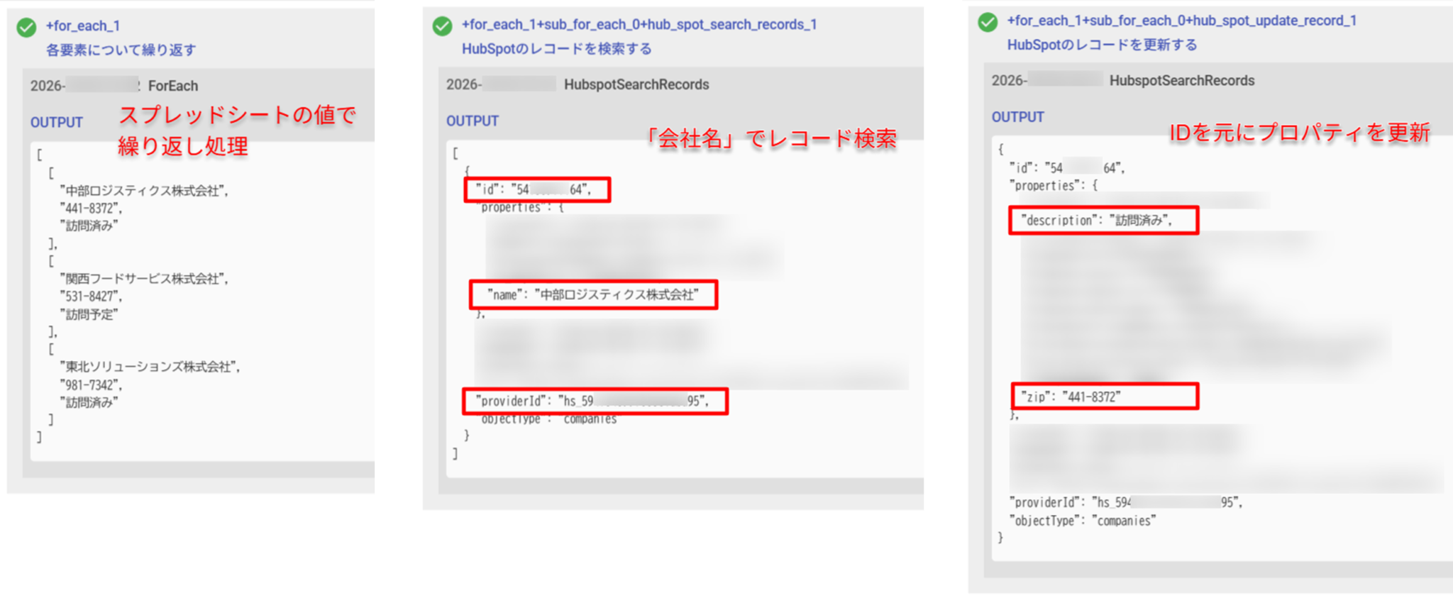 {"id":"${output['id']}","providerId":"${output['providerId']}","objectType":"companies"} - 「更新するプロパティ」に、プロパティ内部名「zip」「description」と更新する値をオブジェクト形式で設定します。