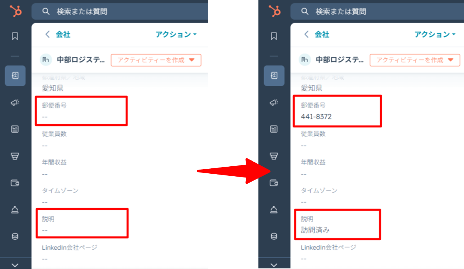 - 対象レコードの「会社名」「都道府県/地域」を更新