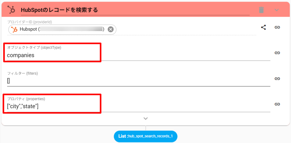HubSpotSearchRecords アクションを実行して出力されるプロパティ(データ項目)は、オブジェクトごとに定められたデフォルトプロパティのみとなります。