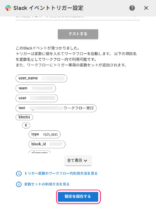 トリガーで起動されるワークフロー内では、変数の呼び出し記法を利用してSlack投稿情報を利用できます。