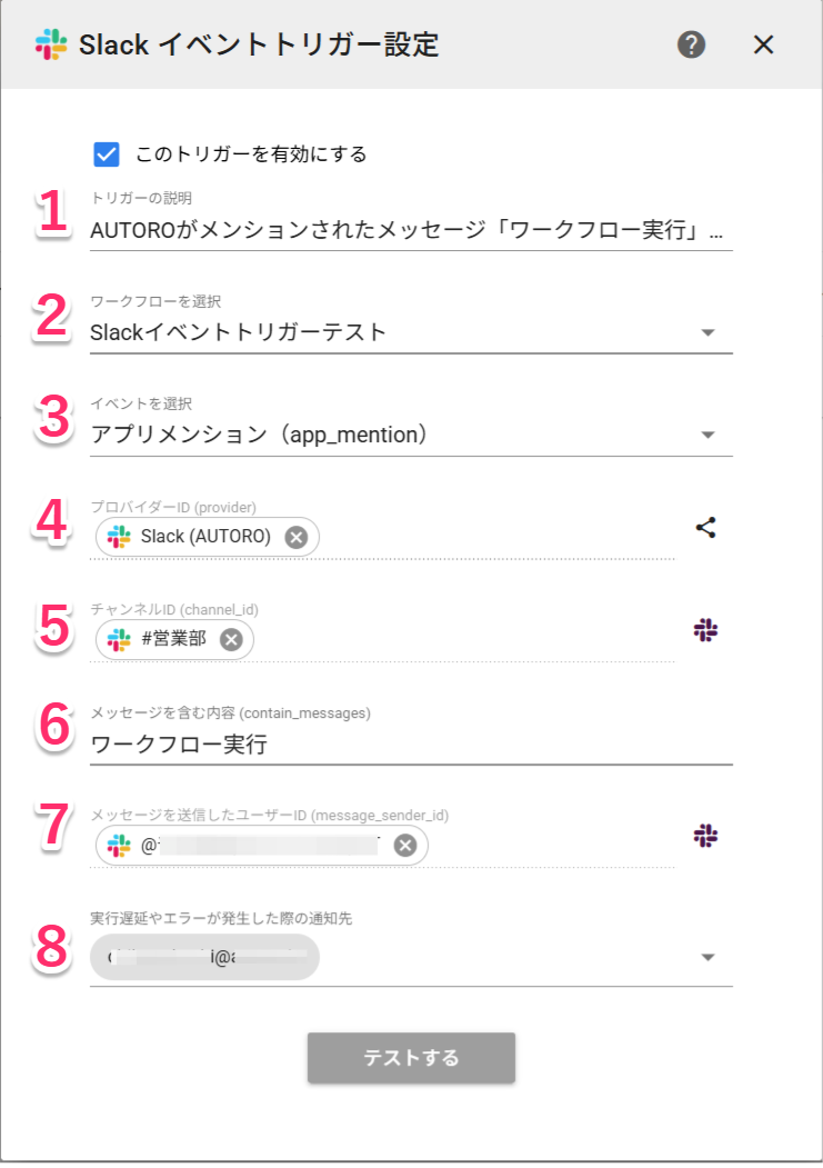 ここで紹介する例は、「営業部」チャンネルでAUTOROアプリがメンションされたメッセージ「ワークフロー実行」が投稿された際にAUTOROワークフロー「Slackイベントトリガーテスト」を起動します。