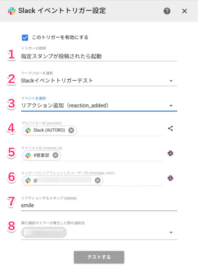 | 7. リアクションするスタンプ | 特定スタンプのみトリガーとする場合、トリガーとなるスタンプを入力します。(例 :smaile: または smaile ) ※スタンプの指定方法に関しては後述します |