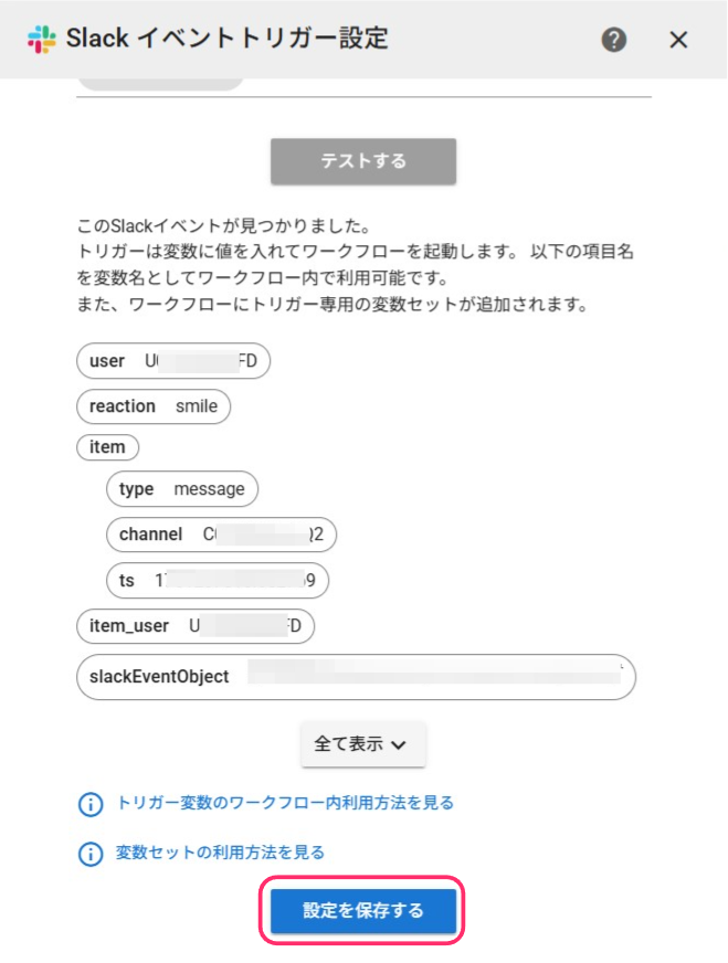 トリガーで起動されるワークフロー内では、変数の呼び出し記法を利用してSlack投稿情報を利用できます。