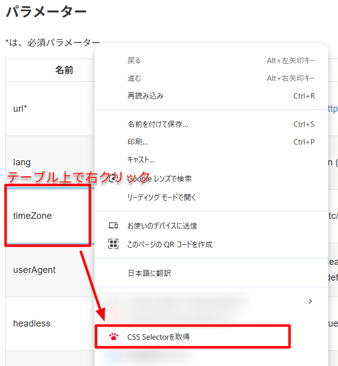 今回は以下Webページ内の「パラメータ」のテーブルを取得します。
