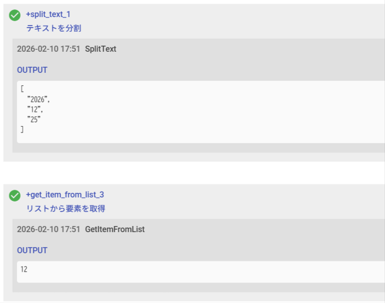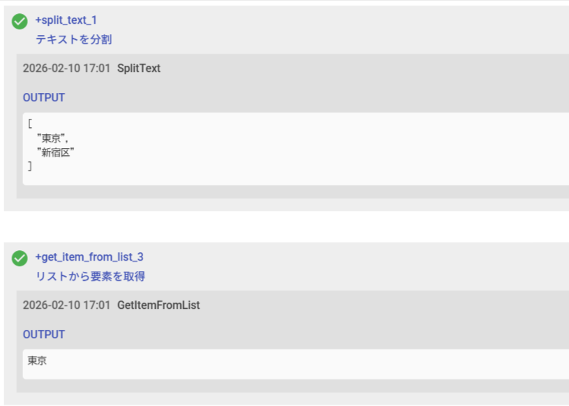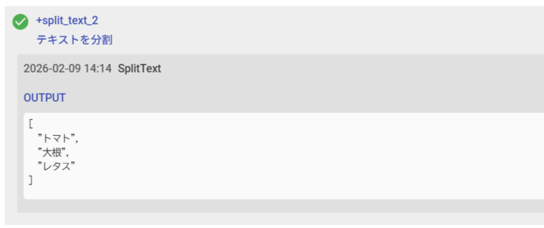 SplitTextアクションは、指定した区切り文字でテキストを分割し各項目をリスト形式で出力します。