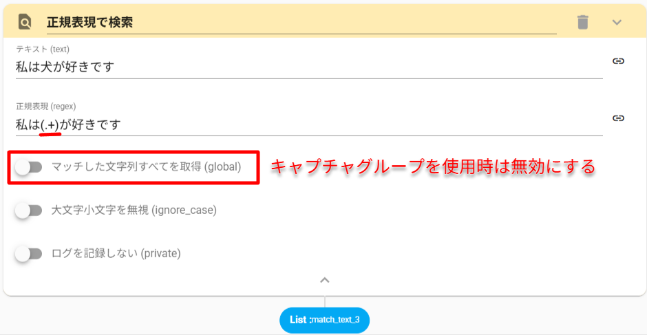 また、キャプチャグループを利用するため、詳細オプション「マッチした文字列すべてを取得」を無効にします。