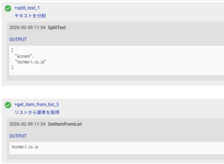 • SplitTextアクションの出力はリスト形式なので、GetItemFromListアクション(リストから要素を取得)で、リストの後半部分(インデックス1)を取得します。