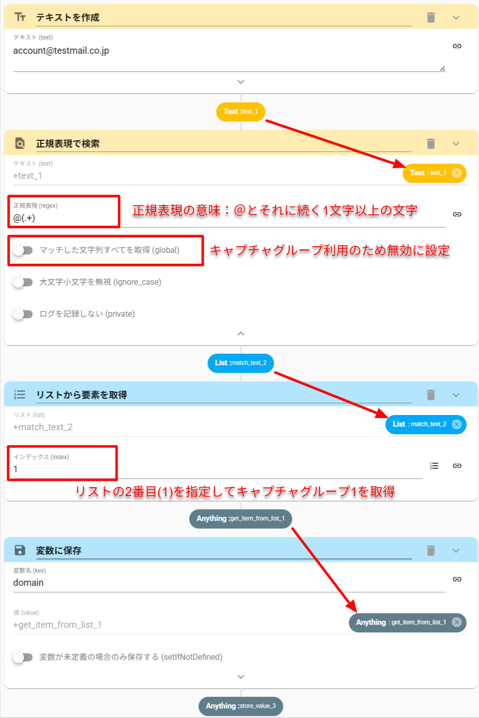 • MatchTextアクションのリスト形式の出力から、GetItemFromListアクションで、キャプチャグループ1(インデックス1)を取得します。