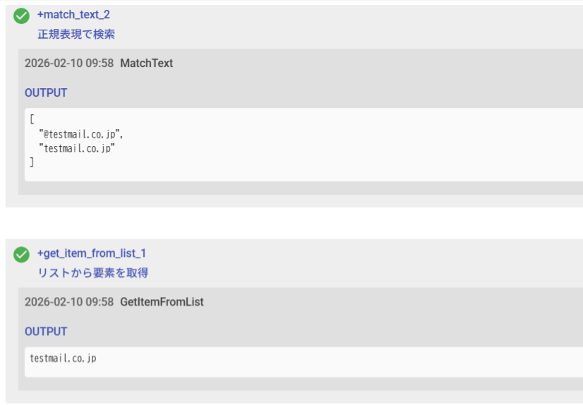 • MatchTextアクションの出力はリスト形式で、詳細オプション「マッチした文字列すべてを取得」を無効にした場合は以下のような出力になります。
