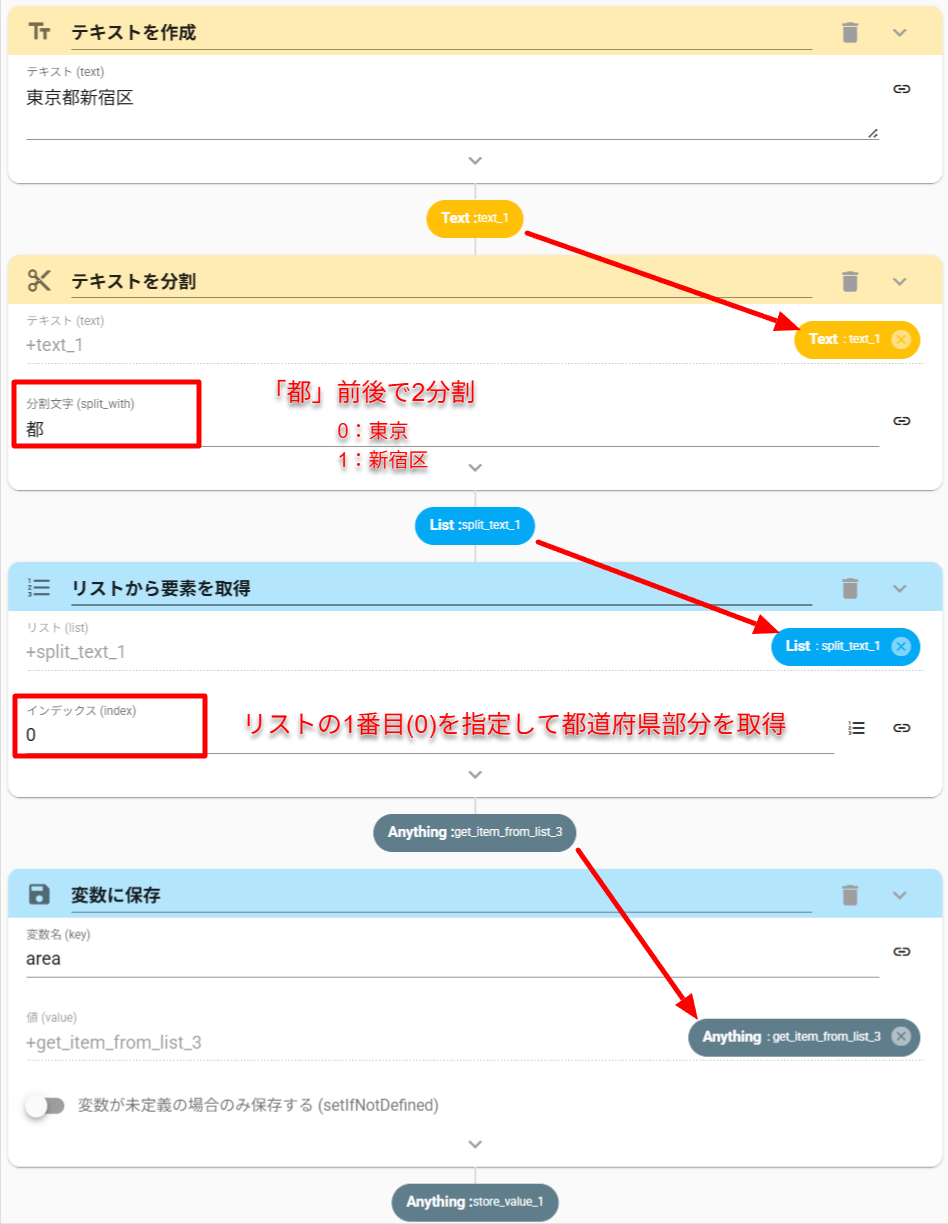 • SplitTextアクションを使用する場合は、区切文字欄に「都」を設定して、住所を前後に分解します。