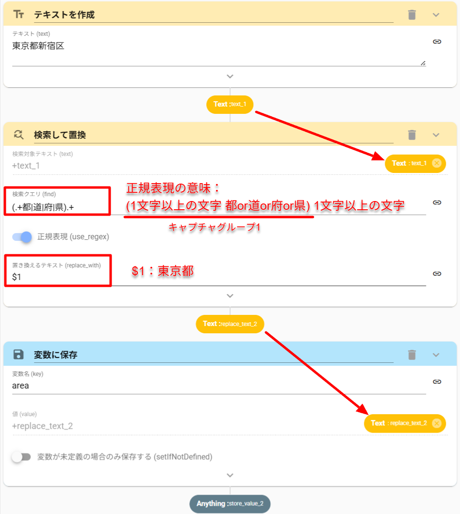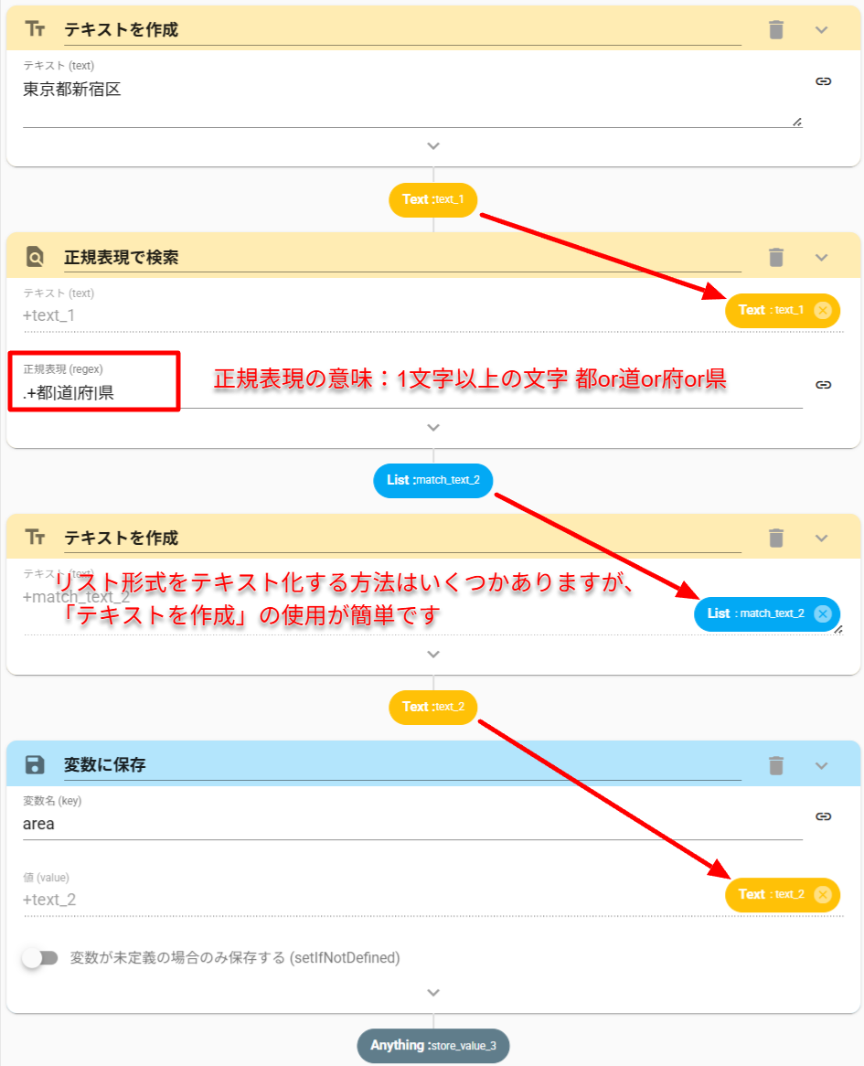 • MatchTextアクションを使用する場合は、正規表現欄に都道府県部分を抽出できる正規表現を設定します。