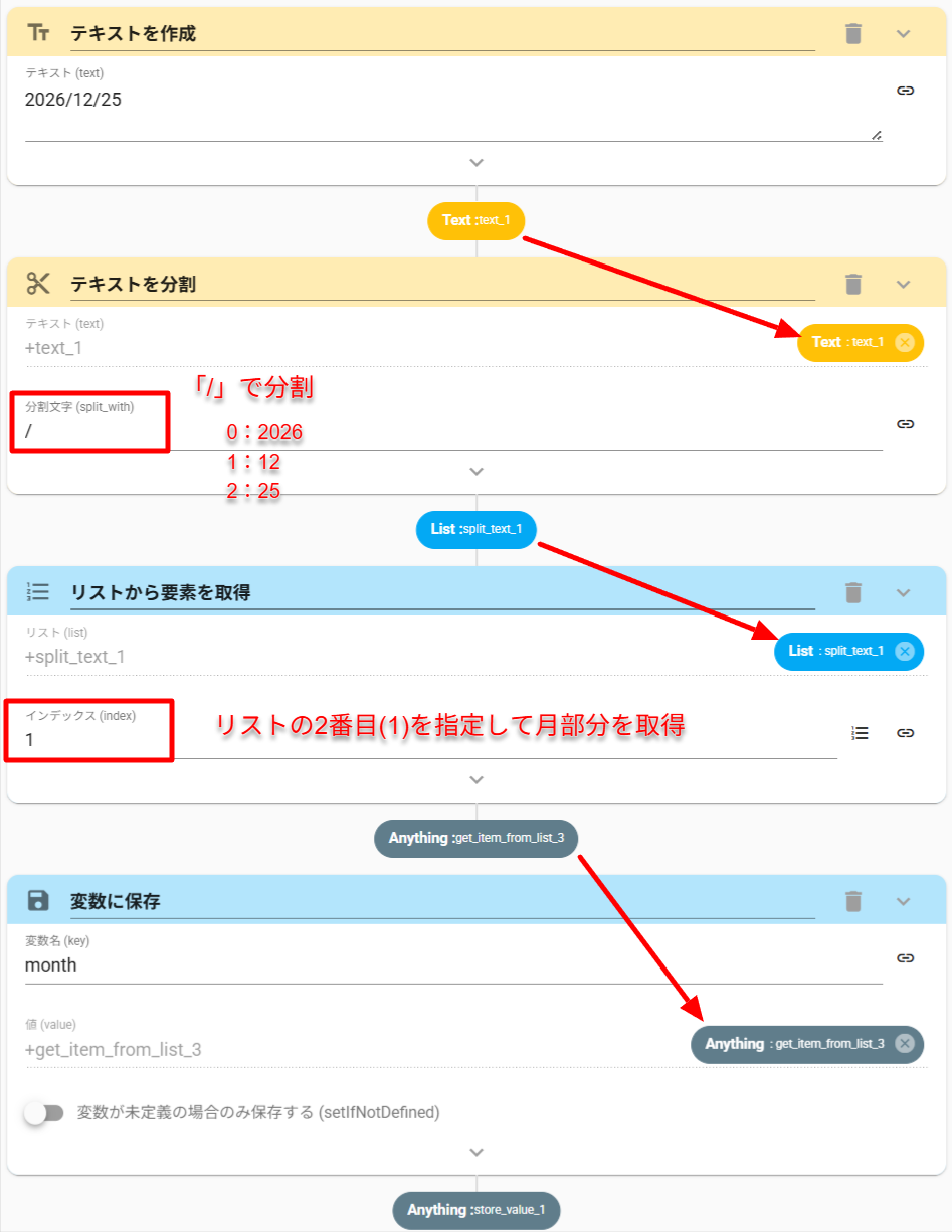 • GetItemFromListアクションで、リストから月部分(インデックス1)を取得します。