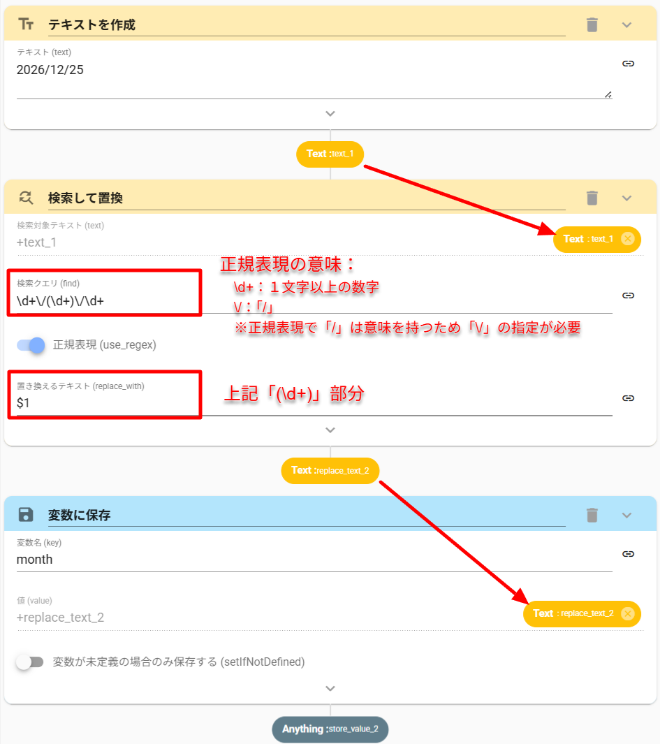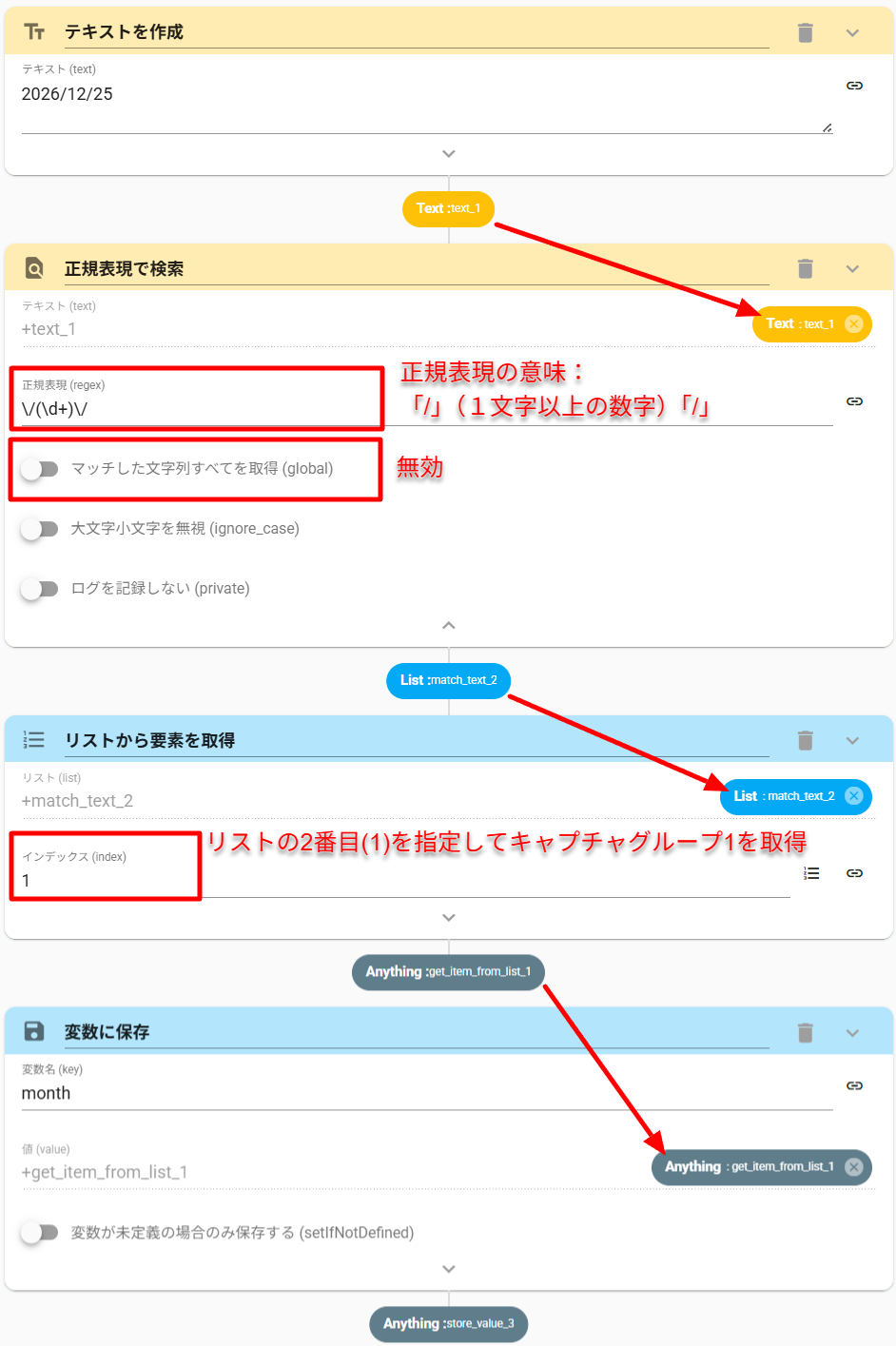 • MatchTextアクションを使用する場合は、正規表現欄に月部分を抽出できる正規表現を設定します。