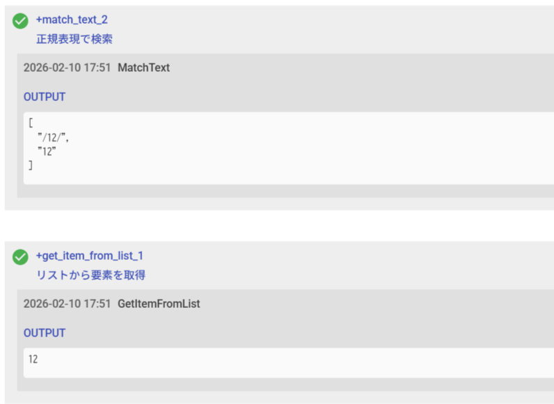 • MatchTextアクションの出力は、抽出結果が1つのみでもリスト形式となります。