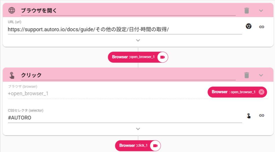 - OpenBrowserアクション(ブラウザを開く)で、このページを開きます。