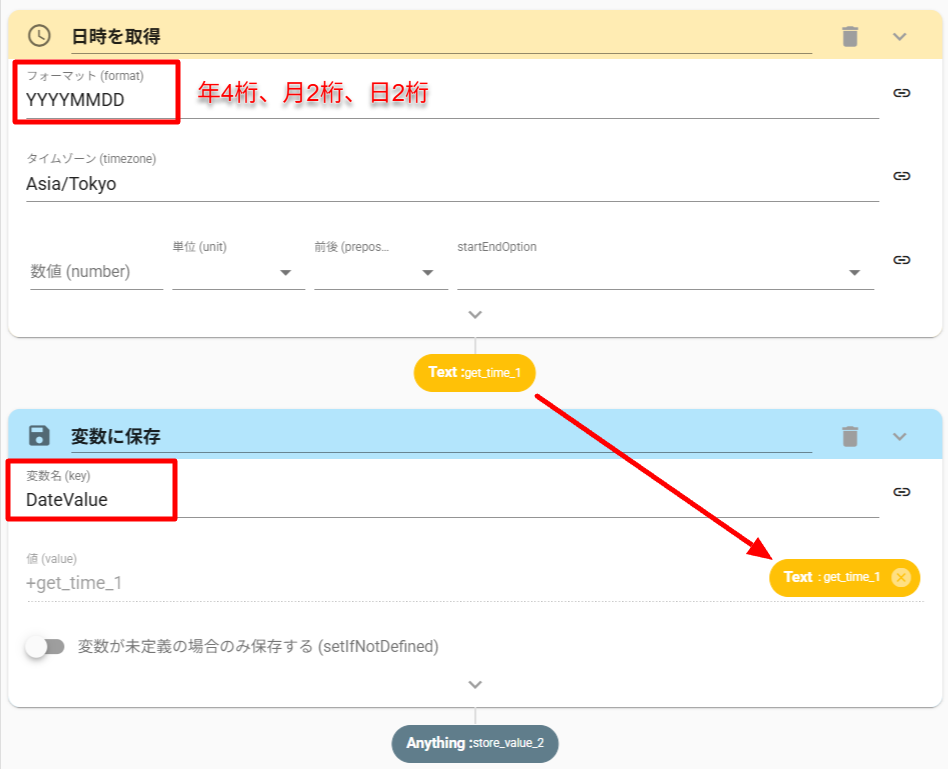 ${moment()}:アクション実行時の日時取得(UTC時刻)${moment().utcOffset(540)}:日本時間の時差(540分)を設定${moment().utcOffset(540).format('YYYY/M/D')}:日付・時間のフォーマットを指定