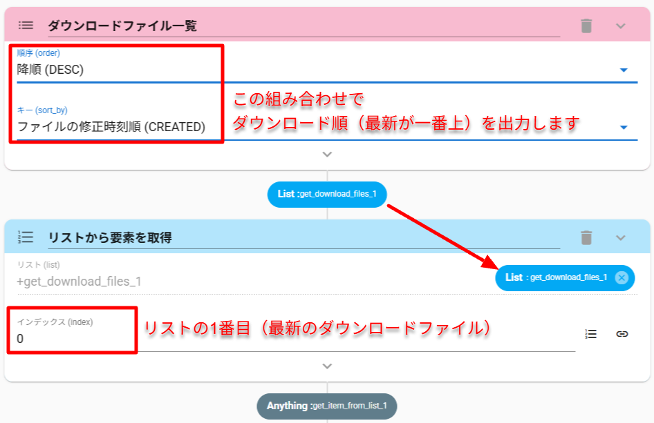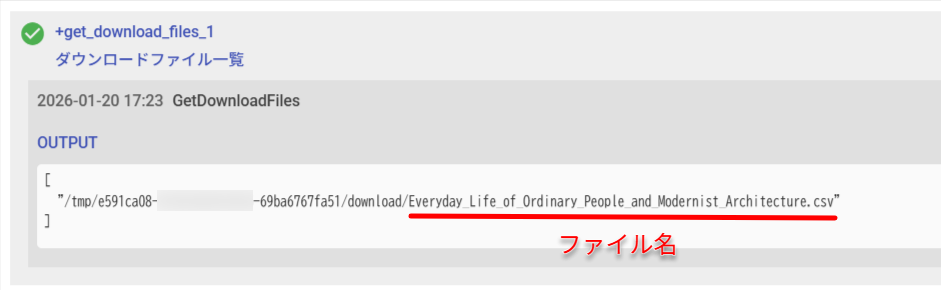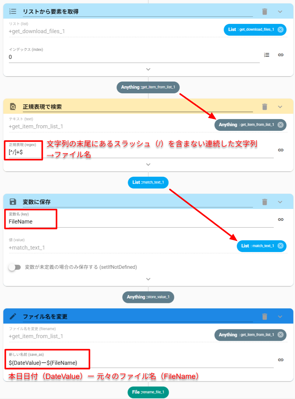 - MatchTextアクション(正規表現で検索)で、最新のダウンロードファイルからファイル名のみを取得します。