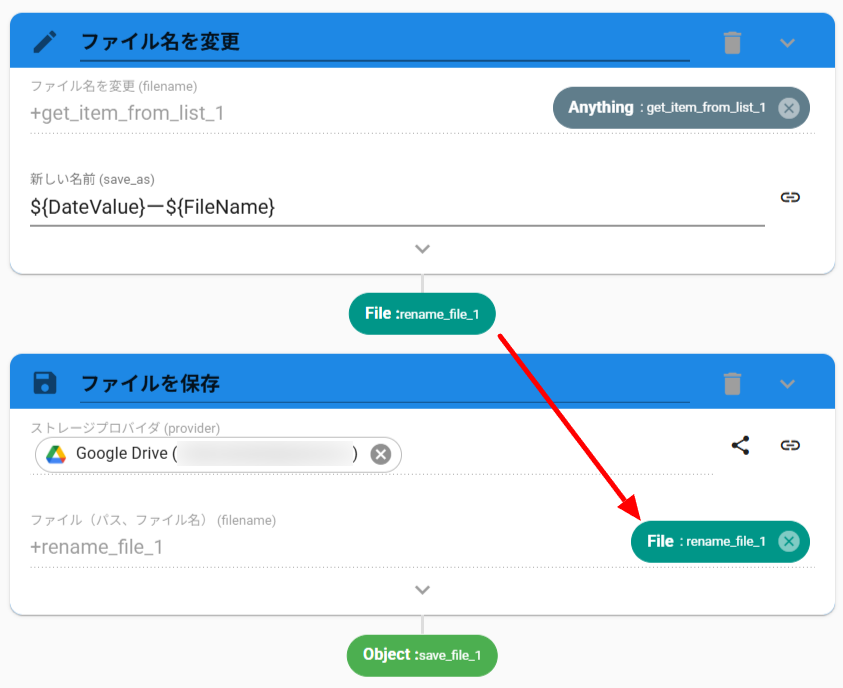 - RenameFileアクション(ファイル名を変更)で、パス情報内のファイル名を変更します。