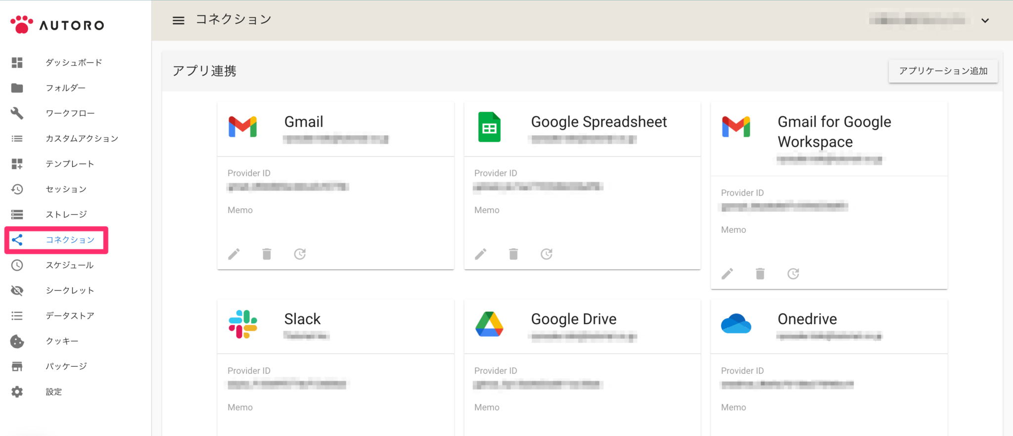 ここで、AUTOROに登録された外部アプリケーションのアカウント連携情報のことを、「コネクション」と呼びます。